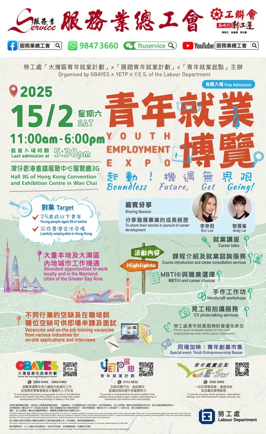 【招聘會】青年就業博覽 日期:2025年2月15日(星期六) 時間:11:00 - 18:00(最後入場時間17:30) 地點:灣仔香港會議展覽中心展覽廳3G 對象:29歲或以下青年、可在香港合法受僱 大量本地及大灣區內地城市工作機遇,不同行業的空缺及在職培訓,職位空缺可供即場申請及面試,免費入場。