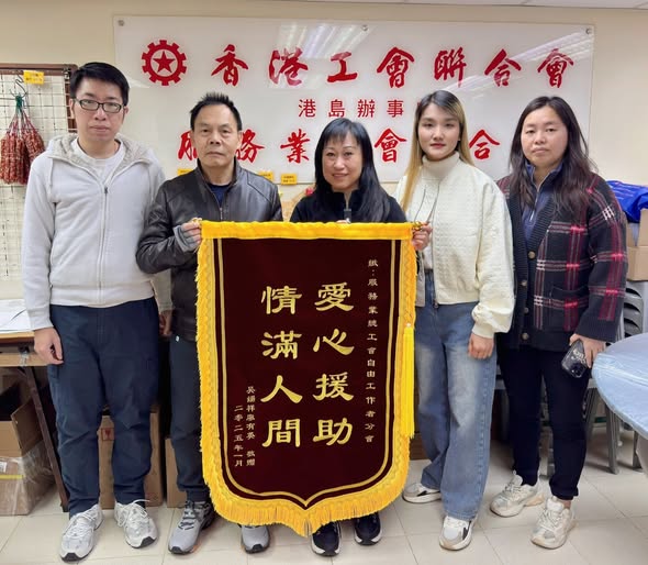 蛇年伊始,#服務業總工會 #自由工作者分會 收到工友吳先生及家屬贈予錦旗“愛心援助 情滿人間”,以感謝本會一直以來盡心盡力為平台工作者爭取權益。 本會曾於2022年10月爆發的ZEEK欠薪事件中,協助工友吳先生追討欠薪申索得直,隨後亦協助吳先生於2023年申請破產欠薪保障基金并成功收到款項。同年2月10日,吳先生工作期間於燈位前停車,被尾隨的士撞倒,其後受傷報案送院治理,本會積極跟進,并交予工友「工聯職安健經濟援助金」,以舒緩工友經濟壓力。2024年5月23日,工友吳先生在東區走廊發生交通意外,受傷程度極度嚴重,處於半昏迷狀態并接受深切治療。本會分會 自由工作者分會 主席 #王師樂 多次前往病房探望,對工友家屬進行關心慰問,安撫情緒,亦協助工友家屬為工友申請「工聯職安健協會」的經濟援助金,緩解家庭壓力。 工友吳先生現在恢復狀況良好,氣色好了許多,親臨工會贈送錦旗予本會,錦旗上短短兩句包含了吳先生對本會權益工作的支持和肯定,本會亦祝福工友身體健康,蛇年大吉。 本會未來會繼續全力以赴,繼續努力,盡心盡力為會員及各行業工友服務,本會亦在此呼籲各位工友在工作期間注意安全,留意工作環境,避免意外發生。最後祝福各位,新春快樂,身體健康,蛇年大吉。